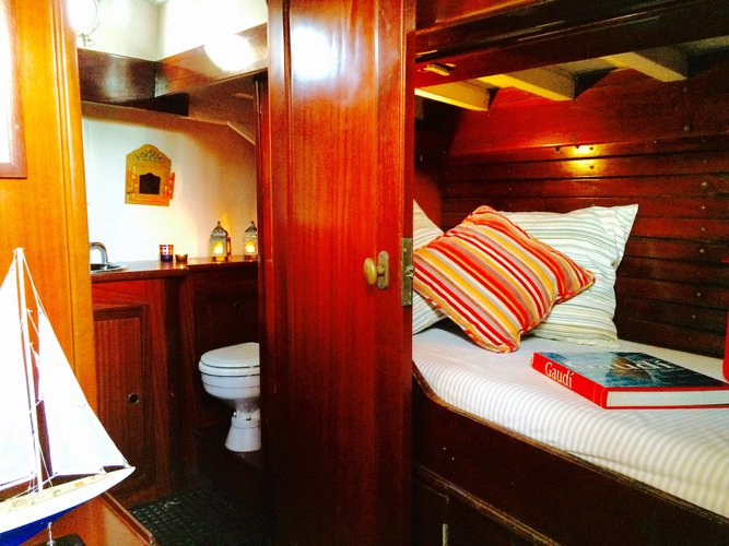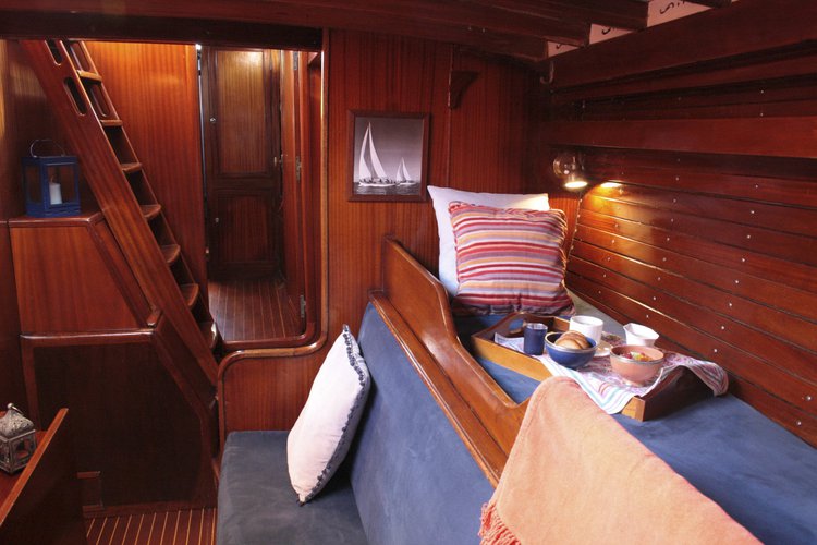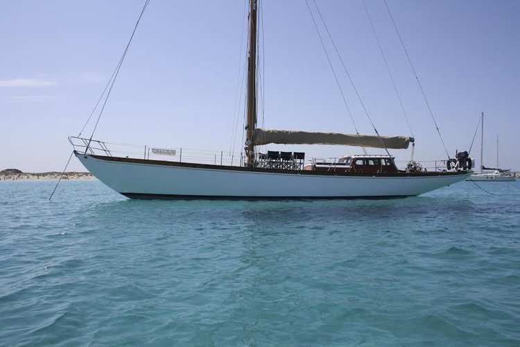 Voilier classique entièrement en bois. 8 couchettes individuelles réparties sur 3 zones: 2 couchettes dans la cabine du capitaine, 4 couchettes dans le carré et 2 couchettes en cabine de proue. Modèle unique , dessiné par Bjarne Aas en 1952 suivant le '12 Metre Cruiser Racer'.