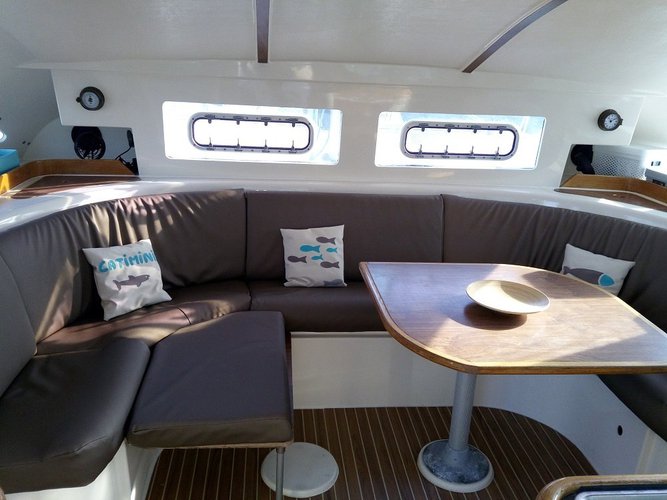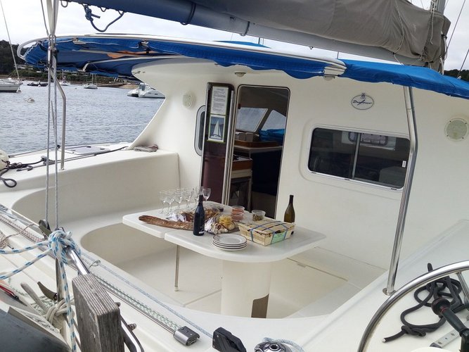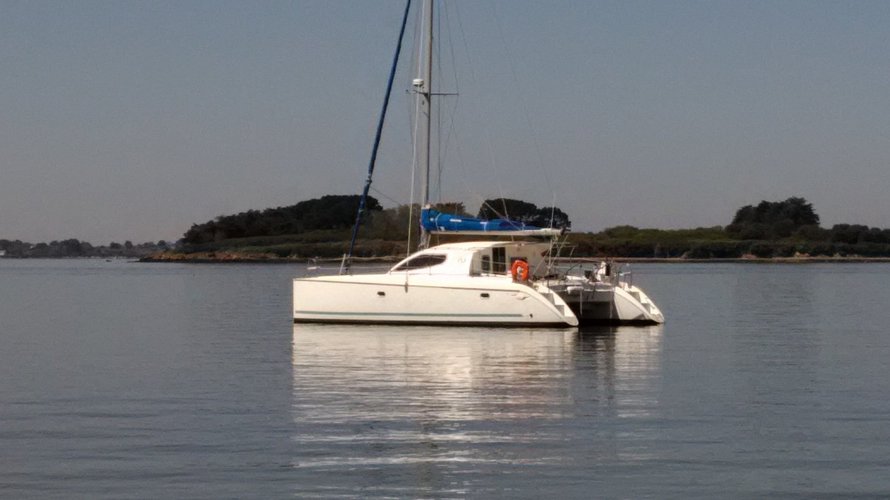 Le bateau est un confortable catamaran de croisière construit par les chantiers Dufour en 2000 sous la marque Nautitech. Jeu de voile neuf 2020 (Grande voile à corne, Génois), Spi code D sur bout dehors.